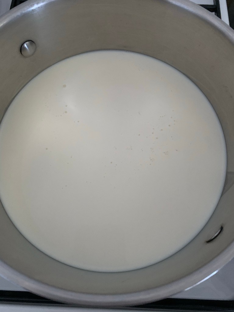Dans une grande casserole faites chauffer le lait et la crème liquide.