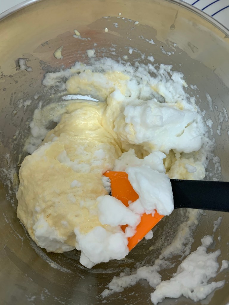 Verser la moitié des blancs sur les poudres et mélanger délicatement sans casser les blancs . Ajouter l’autre moitié , mélanger .