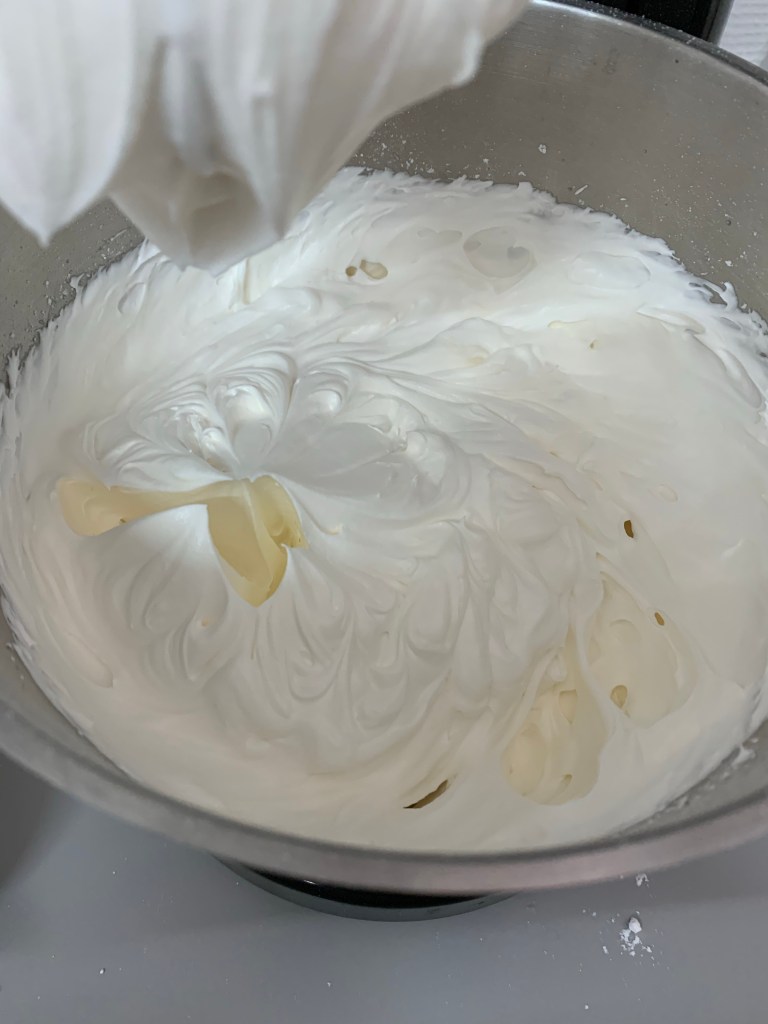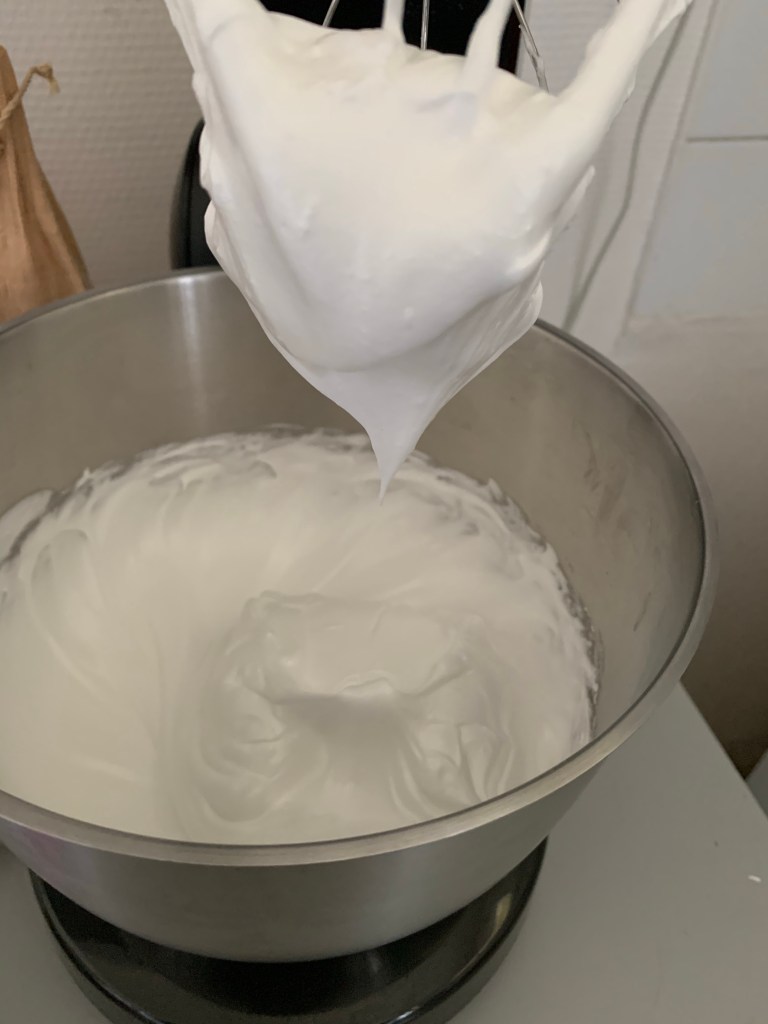 👉🏻Arrêter de fouetter lorsque la meringue est ferme et qu’elle forme le fameux bec d’oiseau .