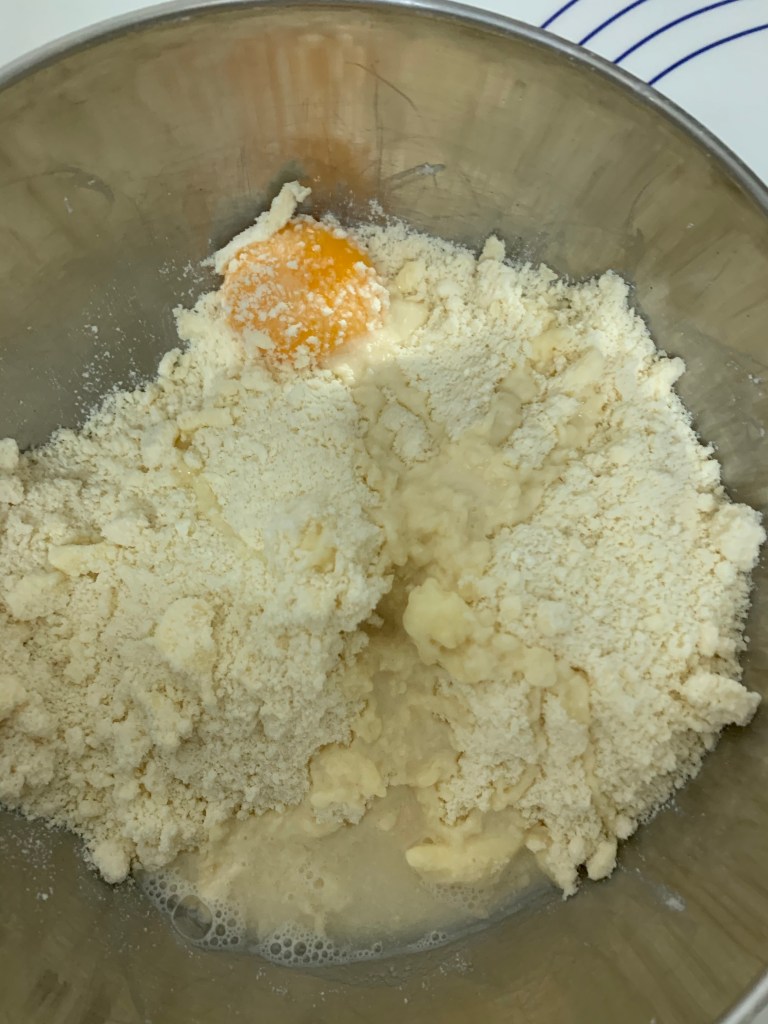 Ajouter le jaune d’œuf et l’eau . Malaxer brièvement la pâte .