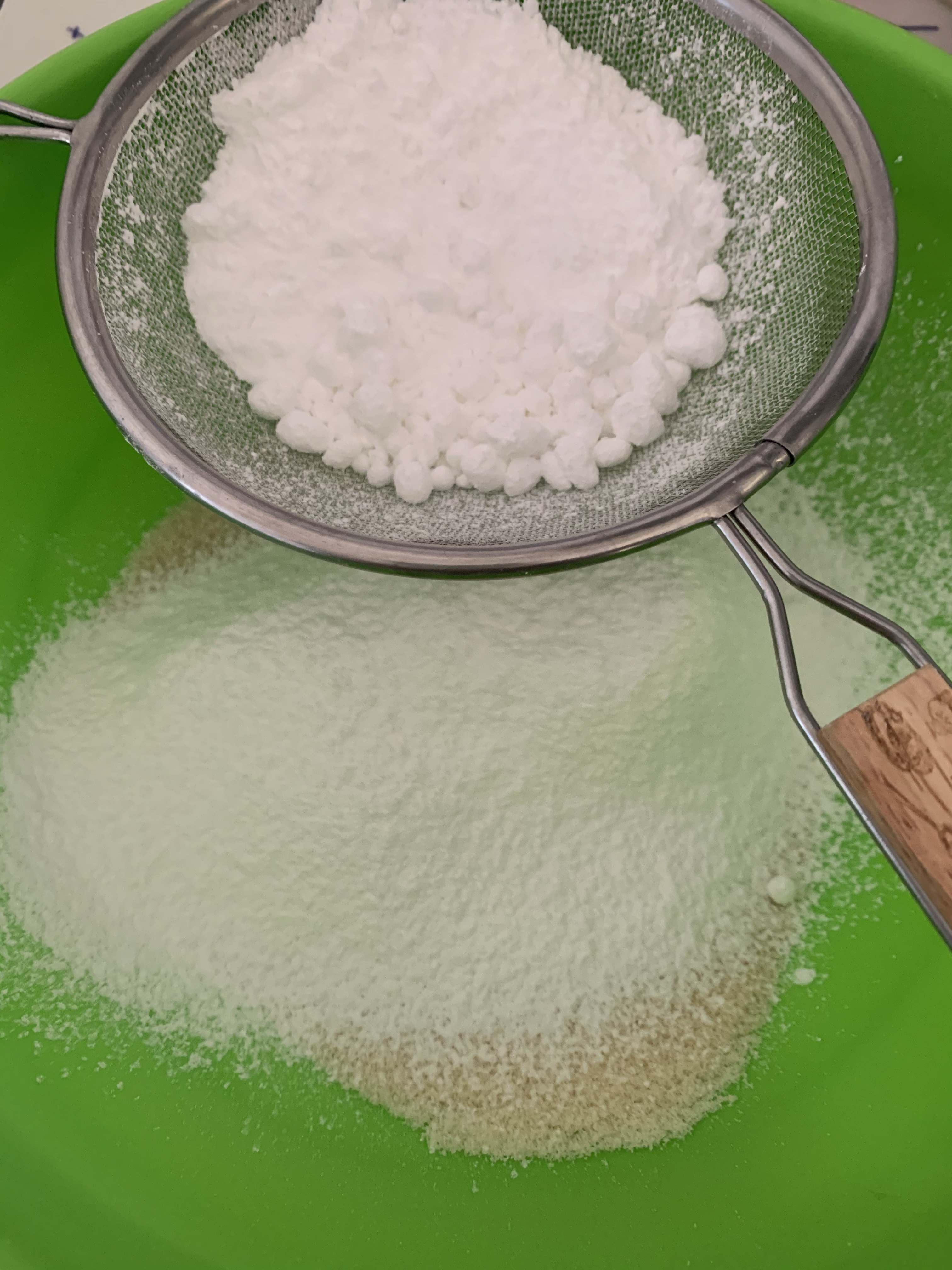 Mélanger le sucre glace avec la poudre d’amandes tamisées