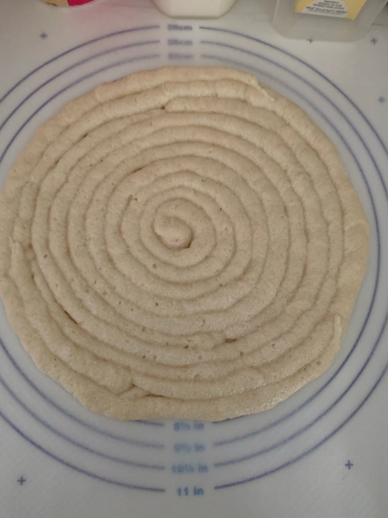 Sur une plaque munie de papier cuisson étaler la pâte (un peu plus grand que le moule ). Pour ma part je transvase la pâte dans une poche à douille et je forme en escargot .