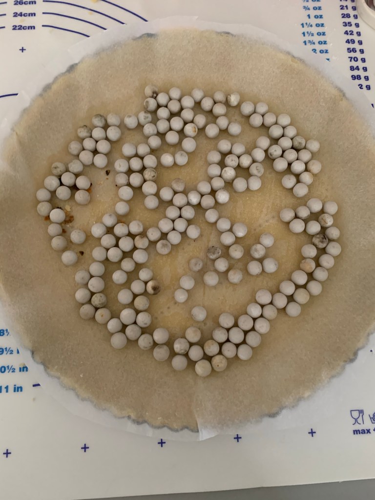Faites cuire 10mn à 180 degrés dans votre four préchauffé. Ôter le « poids » et la feuille , enfourner 10 à 15 mn selon votre four . La pâte doit être dorée .