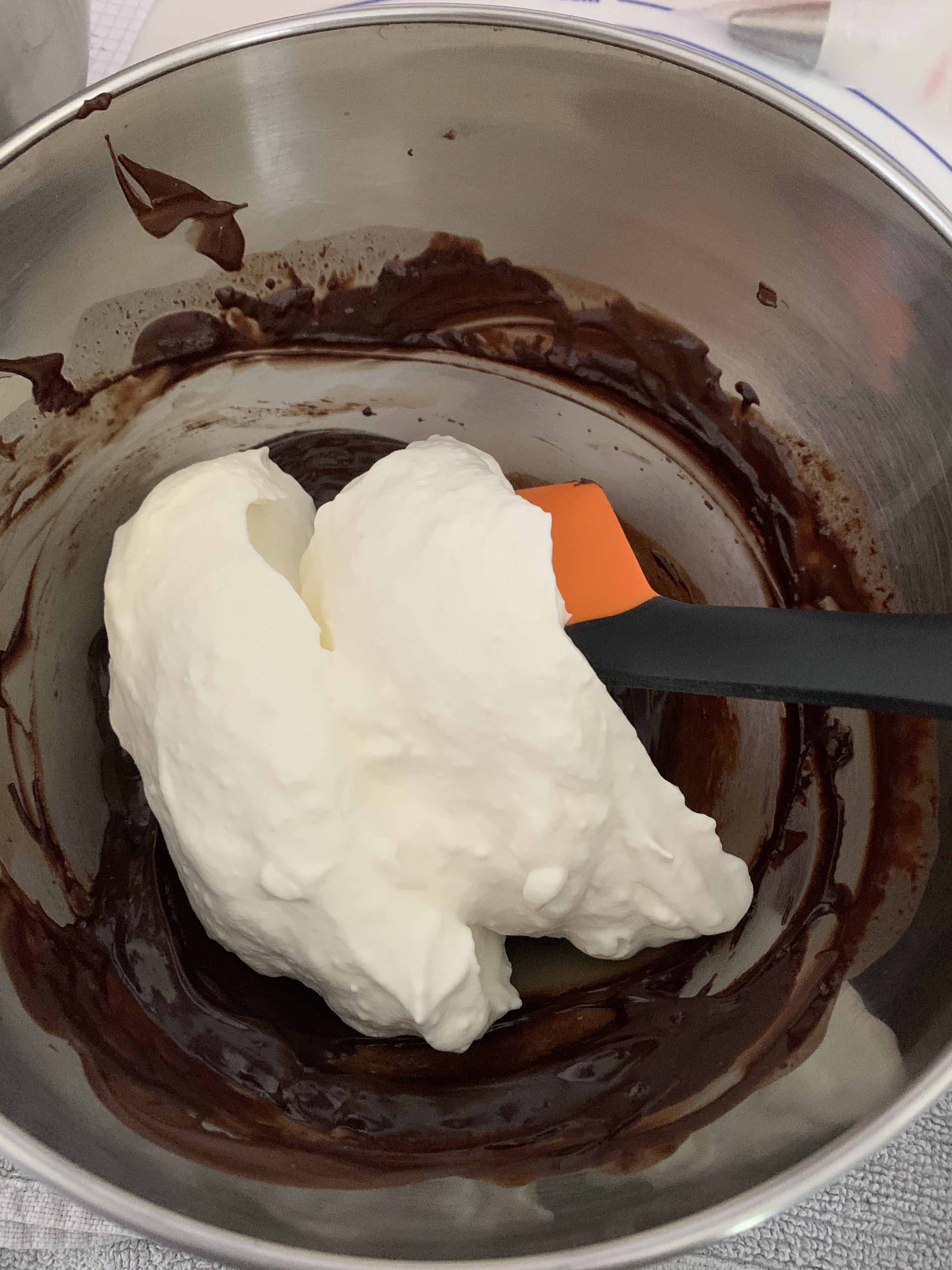 Incorporer un peu de chantilly au chocolat fondu , mélanger délicatement. Enfin le reste de chantilly.