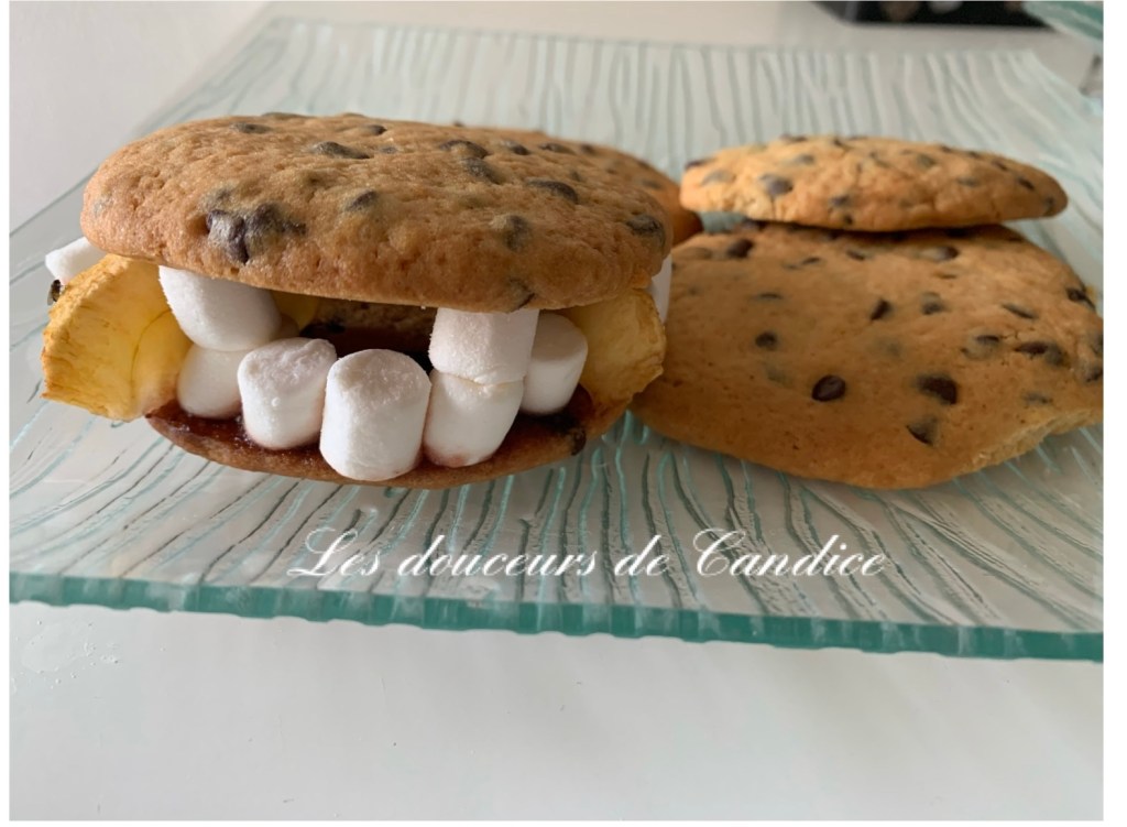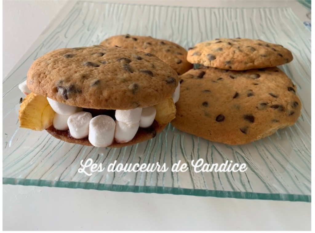 1 œuf, 50g de sucre, 85g de beurre , 150g de farine , 100g de pépites de chocolat, 1 c à c de levure chimique. Confiture de fraise , mini chamallow, 1 pomme coupée en tranches .