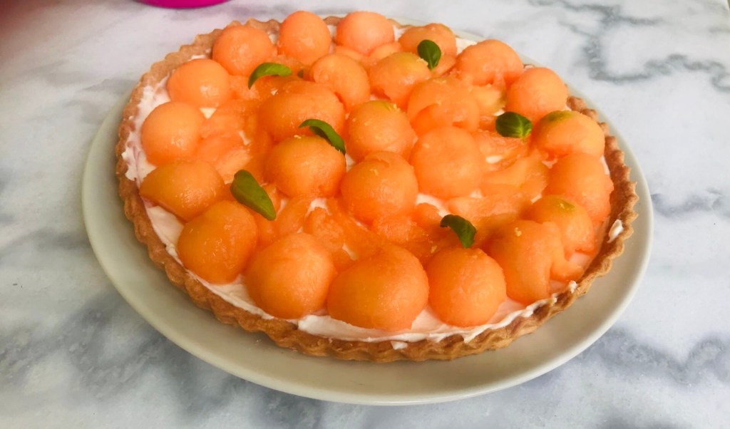 Ingrédients : 1 pâte sablée , 500g de mascarpone, 80g de sucre glace , 2 melons , 1 citron , quelques feuilles de basilic .