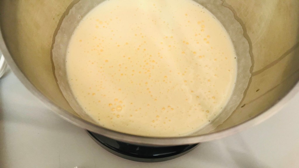 👉🏻Verser progressivement le lait sur le mélange œufs/sucre en fouettant sans cesse .