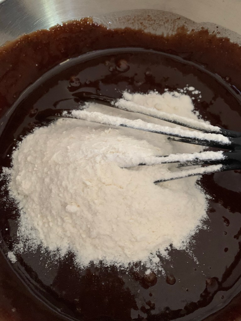 Incorporer la farine , la levure et le chocolat fondu et mélangez bien .