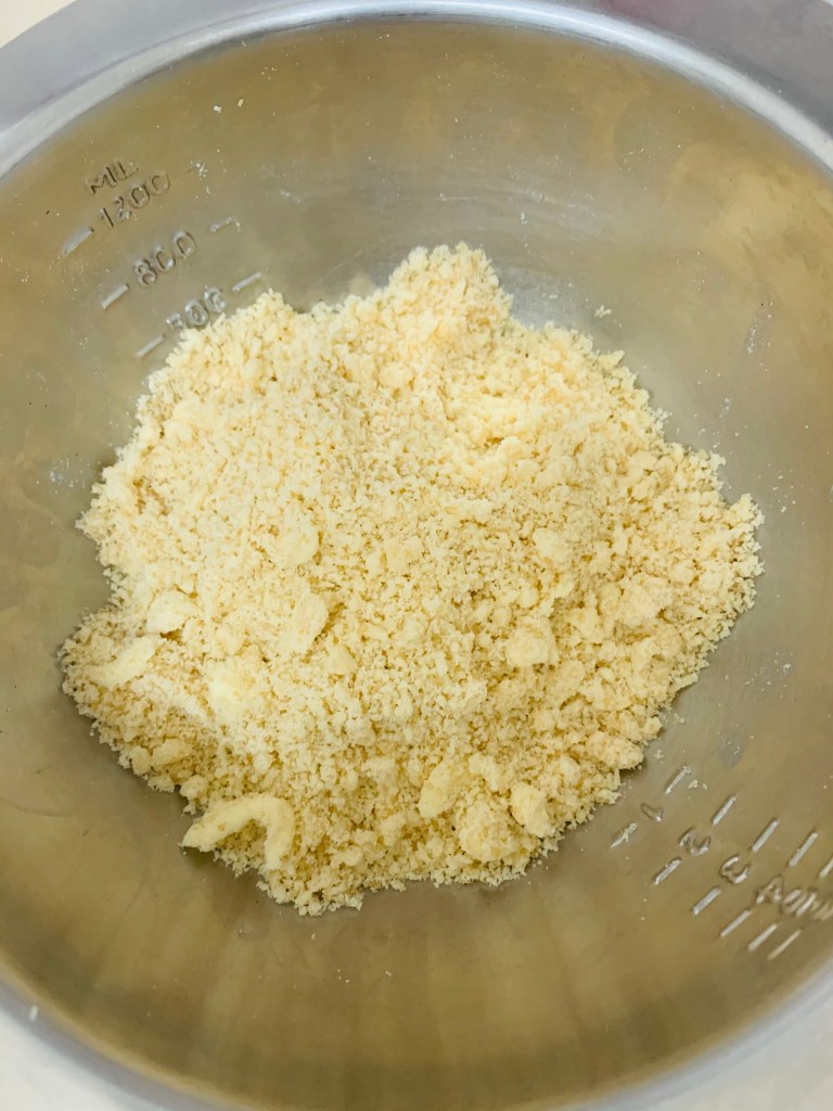 Ingrédients: Pour le crumble : 60g de beurre, 80g de farine, 40g de sucre roux, 30g de poudre de noisette .
