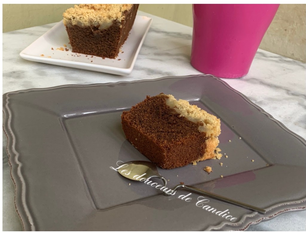 Un beau mariage de la poire et du chocolat et des textures avec le moelleux du cake , le fondant des poires et le croustillant du crumble.